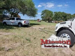 A call came into the dispatch office at Mission Wrecker Commercial Towing Company, requesting for help to rescue a box truck that was stuck in a sand bank. The dispatcher acted fast and sent their Commercial Towing Company technician with a 50-ton wrecker to the location in Floresville, Texas. The Commercial Towing Company technician arrived to find the box truck at the back of the field, bunkered down in a sand bank. After assessing the field to make a plan of action for the tow, the Commercial Towing Company technician parked the wrecker just off the driveway. This position was as close as the wrecker could get, as the Commercial Towing Company technician noticed a septic tank that needed to be avoided in the field, and the 50-ton vehicle was also at risk of getting stuck in the sand if it went too far. Using the heavy wrecker from this far-away position, the Commercial Towing Company technician first tried to tow it directly. This first attempt was not successful, bunkering the box truck down even further into the sand, so the Commercial Towing Company technician had to think of another plan. He called back to the dispatch office at Mission Wrecker HQ in Converse, Texas, and requested for back-up. After a short wait, the second Commercial Towing Company technician arrived onsite, bringing a lighter vehicle – a 4-wheel drive pick-up truck that was able to safely drive over the sandy field. Working together, the Commercial Towing Company technicians used a snatch block, attaching it to the 4-wheel drive so they could run the tow cable through a 90 degree angle between the heavy wrecker and the box truck. The first Commercial Towing Company technician then returned to his heavy wrecker and gently edged the wrecker forward. With the second Commercial Towing Company technician monitoring the cable, this extra tension in the cable pulled the box truck easily from the sand in one smooth tow. With the rescue mission a success, the Commercial Towing Company technicians released the box truck from the tow line, leaving them to complete the job at hand.